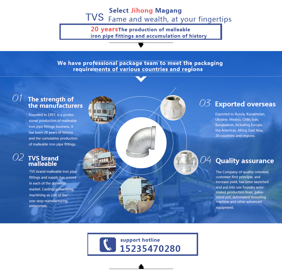 In recent years, the company also started to get involved in the production and sale of domestic malleable iron pipe fittings. TVS brand malleable iron pipe fittings and supply has scored in each of the domestic market.