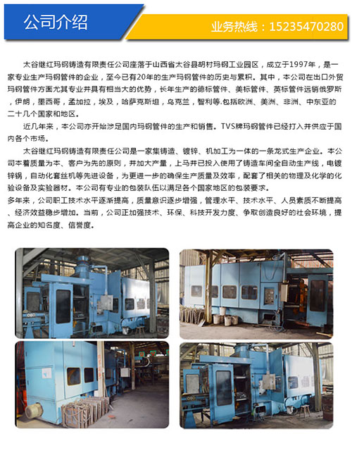太谷繼紅瑪鋼鑄造有限公司是一家專業(yè)生產(chǎn)瑪鋼管件的企業(yè),至今已有20年的生產(chǎn)瑪鋼管件的歷史與累積。本公司在出口外貿(mào)瑪鋼管件方面尤其專業(yè)并具有相當(dāng)大的優(yōu)勢(shì),長(zhǎng)年生產(chǎn)的德標(biāo)管件、美標(biāo)管件、英標(biāo)管件遠(yuǎn)銷俄羅斯,伊朗,墨西哥,孟加拉,埃及,哈薩克斯坦,烏克蘭,智利等.包括歐洲、美洲、非洲、中東亞的二十幾個(gè)國(guó)家和地區(qū)。